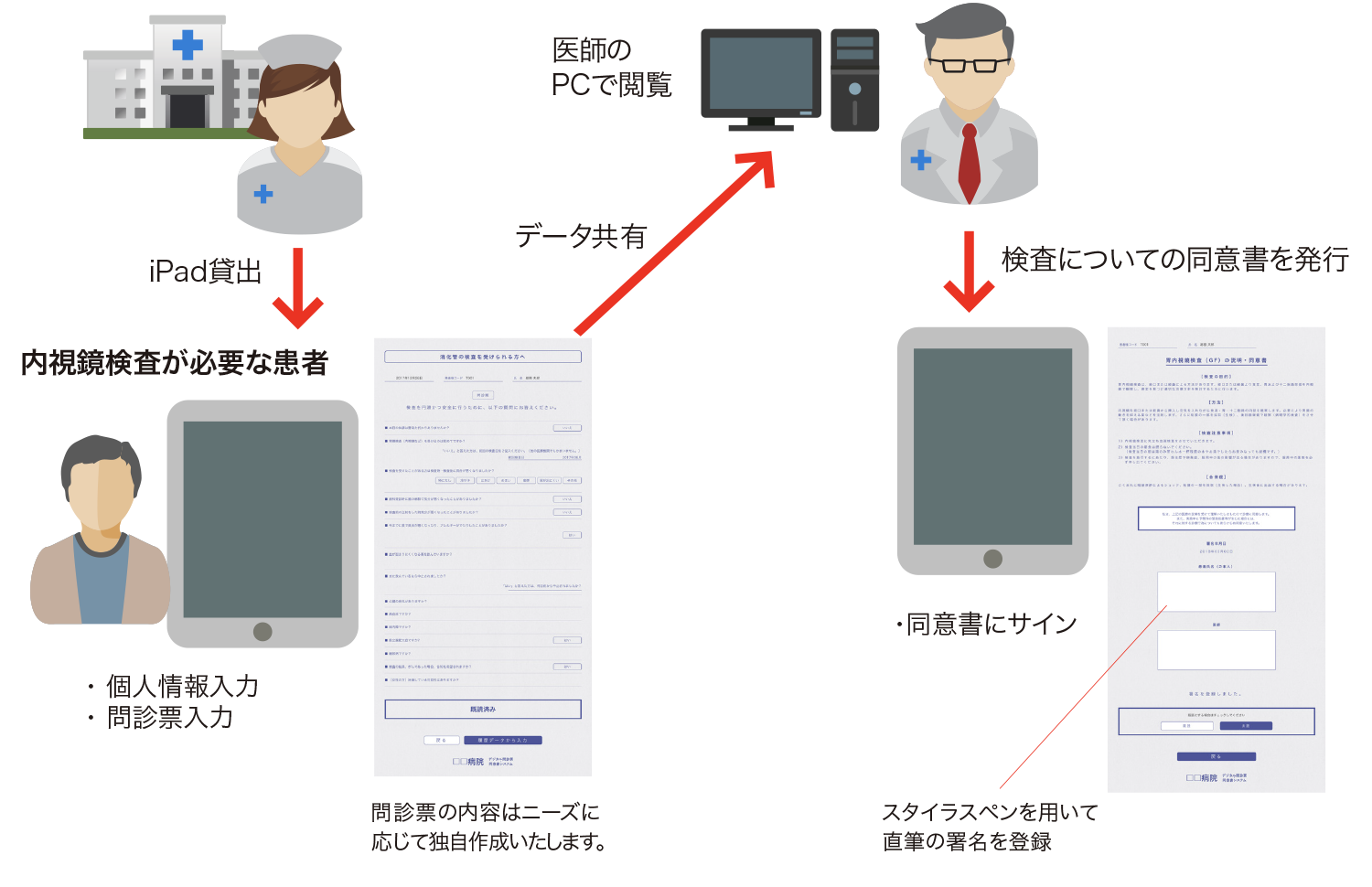 院内のペーパレス化対策として、内視鏡検査などを行う際に必要な問診票と検査同意書をペン入力できる仕組みを作成いたしました。